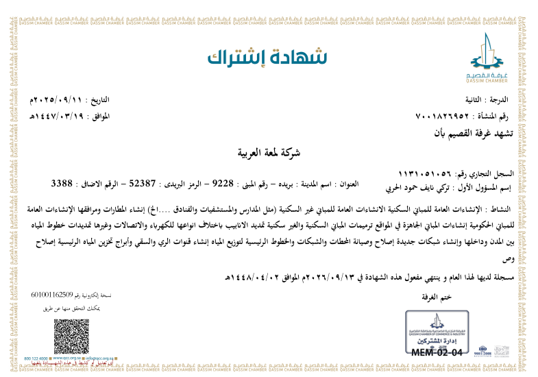 تفخر شركة لمعة العربية للمقاولات بحصولها على عدة شهادات وخطابات شكر وتقدير من جهات حكومية وخاصة، تقديرًا لالتزامها بالجودة العالية، ودقتها في التنفيذ، واحترافيتها في إدارة المشاريع. تمثل هذه الشهادات دليلًا واضحًا على ثقة عملائنا بما نقدمه من خدمات إنشائية متكاملة، وحرصنا المستمر على تطبيق أعلى المعايير الفنية والهندسية في كل مشروع. وتعد هذه الإنجازات حافزًا لنا لمواصلة التطوير، وتعزيز مكانة لمعة عربية كشريك يعتمد عليه في مشاريع البناء والتشييد بالمملكة.